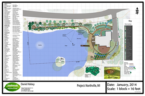 The new homestead vision with access to the features being the primary concern. Greenhouse (with thermal heat collection) is on a boardwalk from the house and connected to the two-car garage and workshop. All buildings are accessible from the road and interconnected. The South facing greenhouse is behind the garage as a windbreak. Steep erodable shorelines drop to a clear water lake. These must be maintained at a distance with deep-rooted trees and shrubs. The clear lake is a great resource for fish and access to other lakes in the area. Very few properties we have worked on have been on a lakeshore.