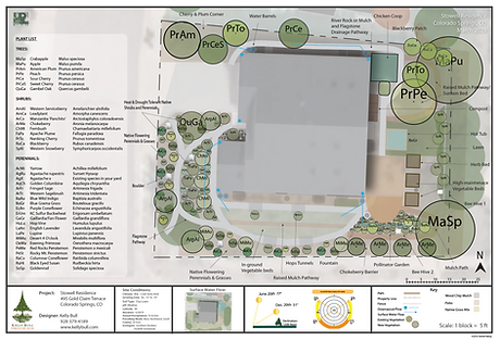 This residential landscape is designed to enhance the mountain views without blocking them and to provide food, beauty, wildlife support, and opportunities for entertaining and relaxing. Except for a few fruit trees, all native and drought-tolerant plants were chosen to enhance the ecological impact of the property as well as ensure a high rate of plant success.